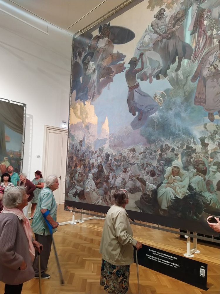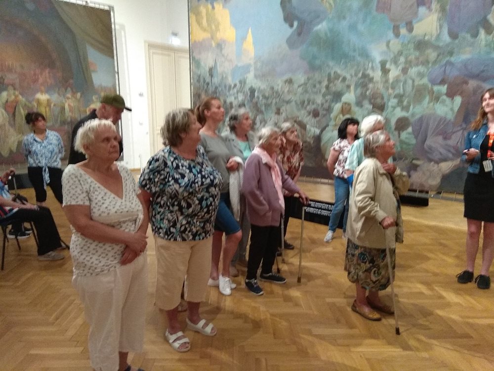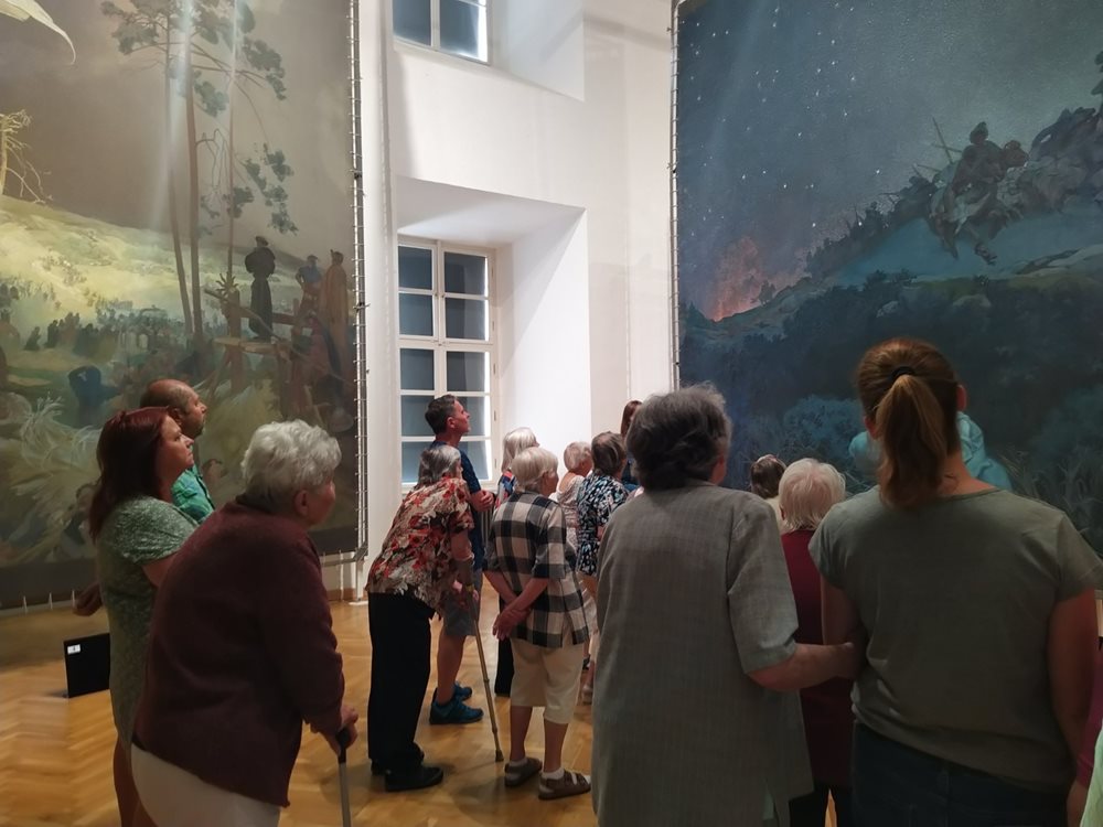 Ráno jsme vyjeli z domova autobusem a v slunečné poledne jsme již stáli před Slovanskou epopejí. Jedinečná scenerie se nachází na zámku v Moravském Krumlově. Díky velkoformátovým rozměrům se klienti rázem propadli v čase o několik století. Preciznost Alfonse Muchy, rodáka z Ivančic všechny nadchla. „Líbí se mi jeho motivy, které odkazují na naši historii,“ podotkla klientka z oddělení 1 paní Benešová.