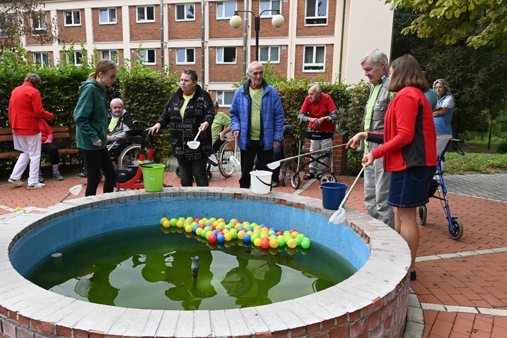 Soutěž byla rozvržena do pěti disciplín, které byly modifikovány tak, aby je bez problému zvládli i naši hendikepovaní klienti. Jednou z těchto disciplín bylo například lovení míčků z kašny.