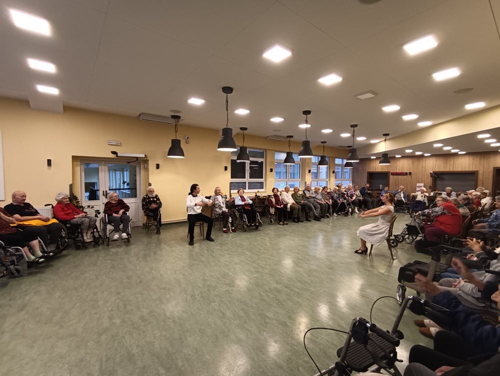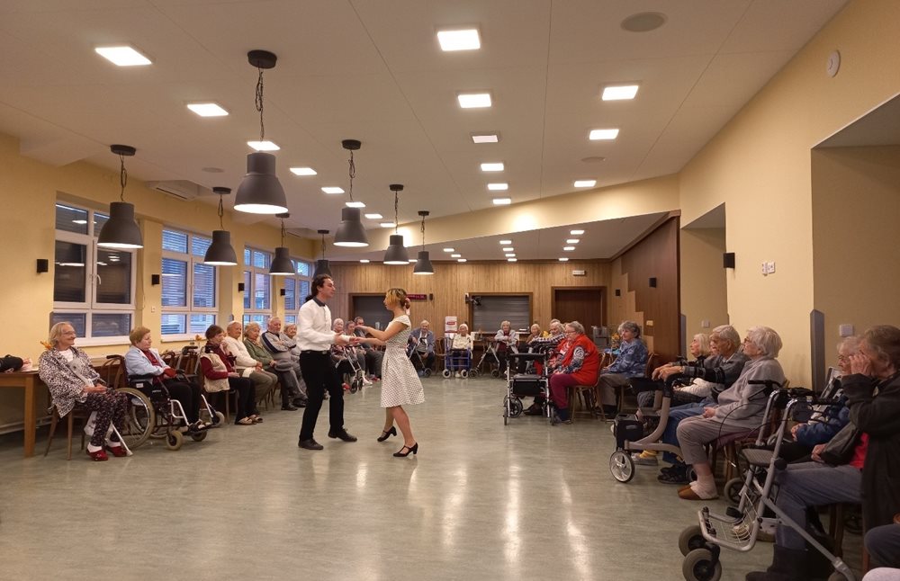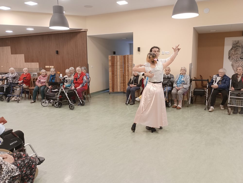 Středeční odpoledne 23. listopadu se neslo v tanečním duchu. Přijeli nás navštívit dva mladí tanečníci z projektu Mosty podporovaného Ministerstvem školství. Přijeli nás provést historií tanců i s ukázkou. Předvedli tance od baroka až po rock´n´roll. Klientům se taneční vystoupení moc líbilo. Malou ukázku přikládáme ve fotografiích níže.
