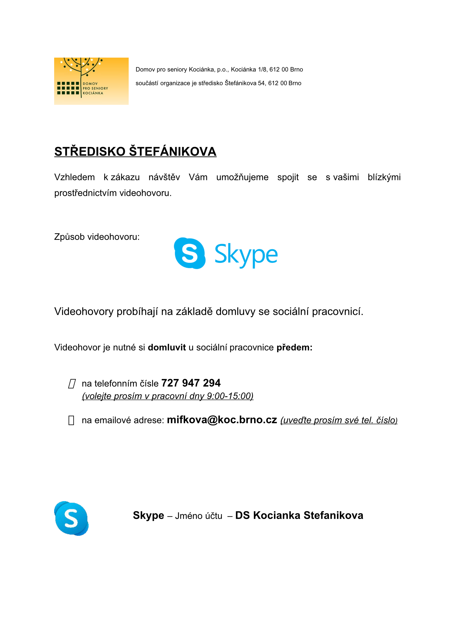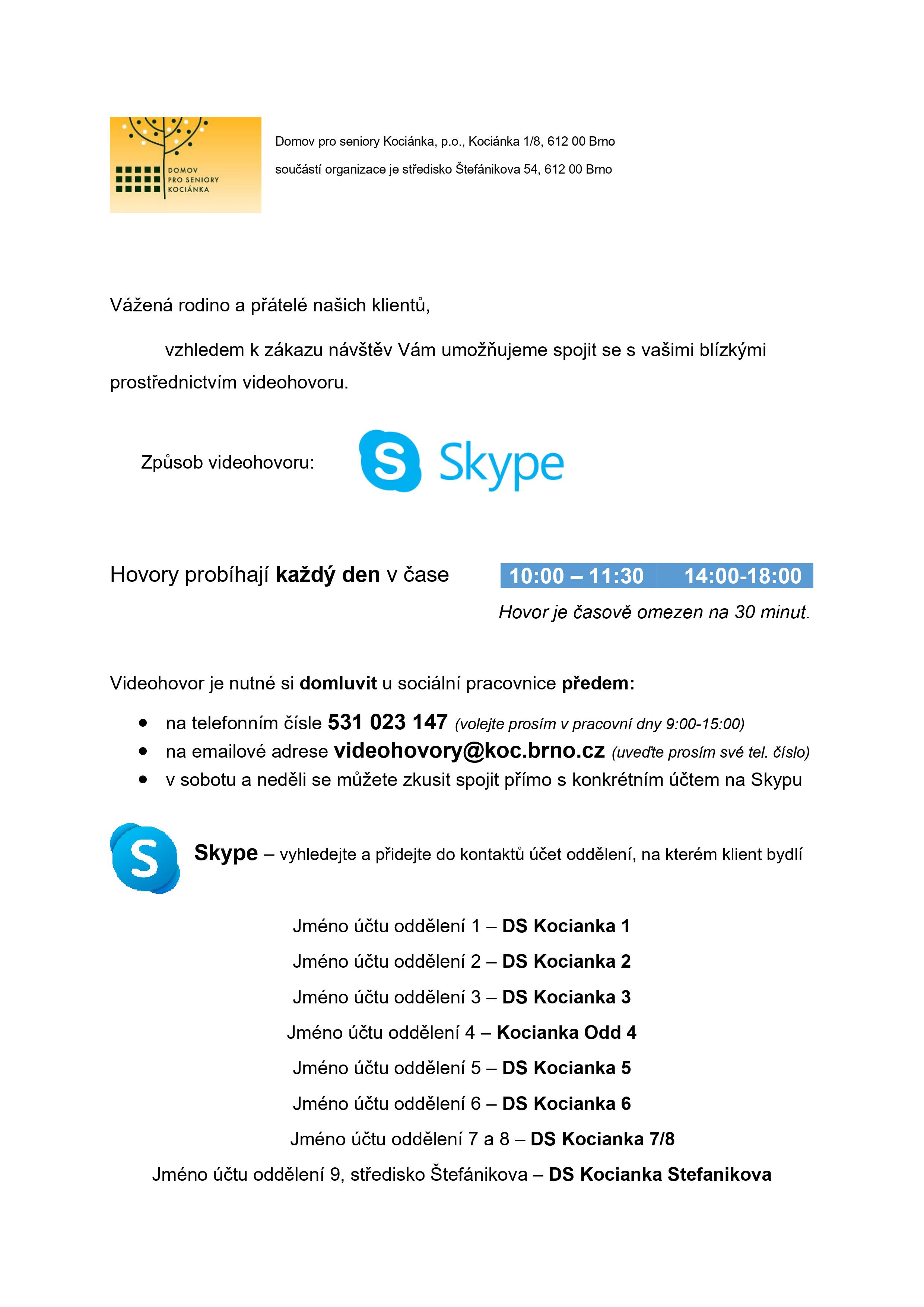 Vážené rodiny a přátelé našich klientů, nabízíme možnost spojit se s vašimi blízkými prostřednictvím videohovoru.