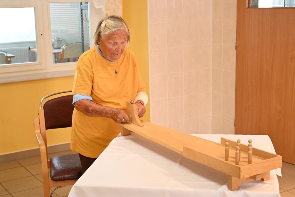 Náš tým měl jako první stanoviště Mölkky - shazovaní dřevěných kolíků v zahradním altánku. Poté jsme se přesunuli k ruským kuželkám. Následovala další disciplína - dřevěné kuželky v aktivizační místnosti DS a jako poslední byly stolní kuželky v jídelně.